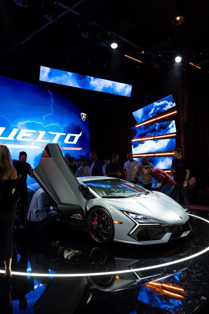 As the evening reached its climax, the reveal of the Revuelto was spectacular. A dynamic fusion of sound and light enveloped the space, building an electrifying atmosphere that echoed the power and precision of Lamborghini’s engineering and the electrified hybrid technology. The room pulsed with energy as the Revuelto emerged, its sleek lines and futuristic design illuminated under a choreographed display of lights, while the deep, resonant growl of its engine reverberated through the venue.