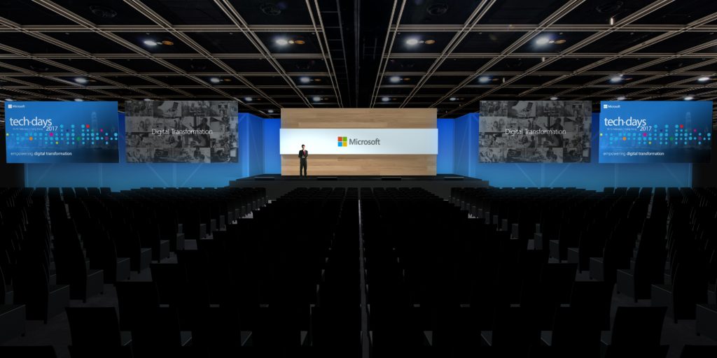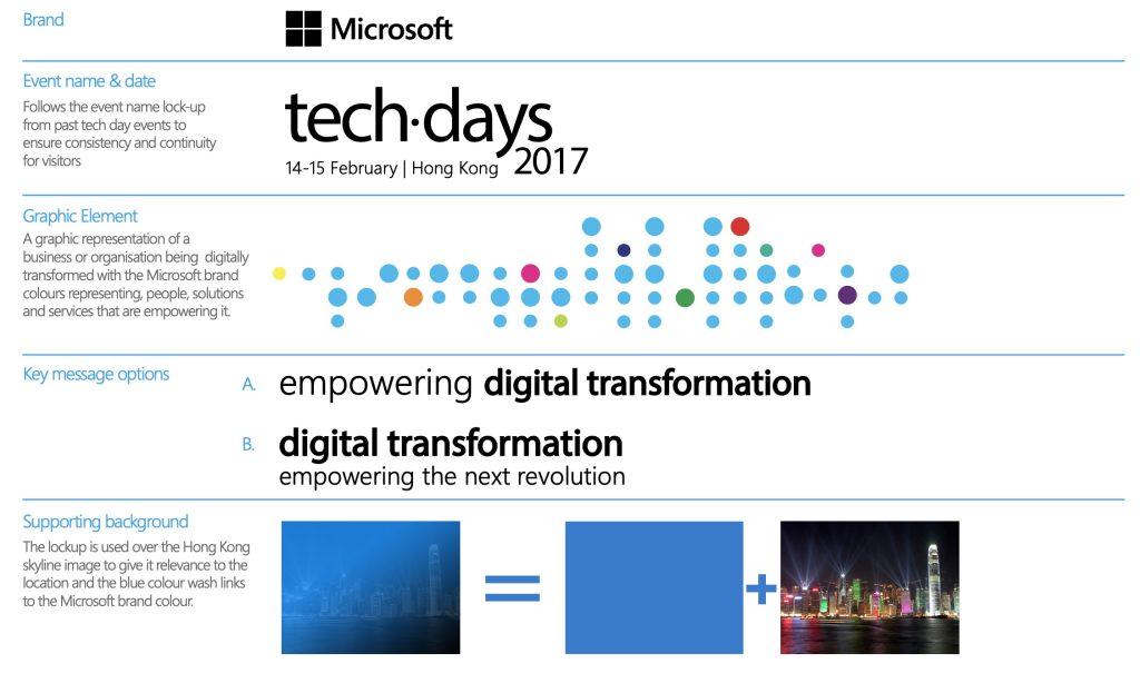 As a key conference for Microsoft in Hong Kong, I provided creative direction and design for the overarching conference identity and stage design. The key visual direction for the event aimed to create a distinctive yet brand-aligned identity that could be easily applied across all digital and physical assets. Building on previous Tech Day event lock-ups for continuity, the design featured a central graphic symbolizing digital transformation, with Microsoft brand colours representing people, solutions, and services. The event’s key message positioned Microsoft as the essential partner in empowering business transformation, reinforced visually with a Hong Kong skyline backdrop and brand-coloured wash. The stage design fully immersed attendees in the Microsoft ecosystem, using a large blue backdrop and dynamic LED pillars to highlight transformation themes and content transitions.